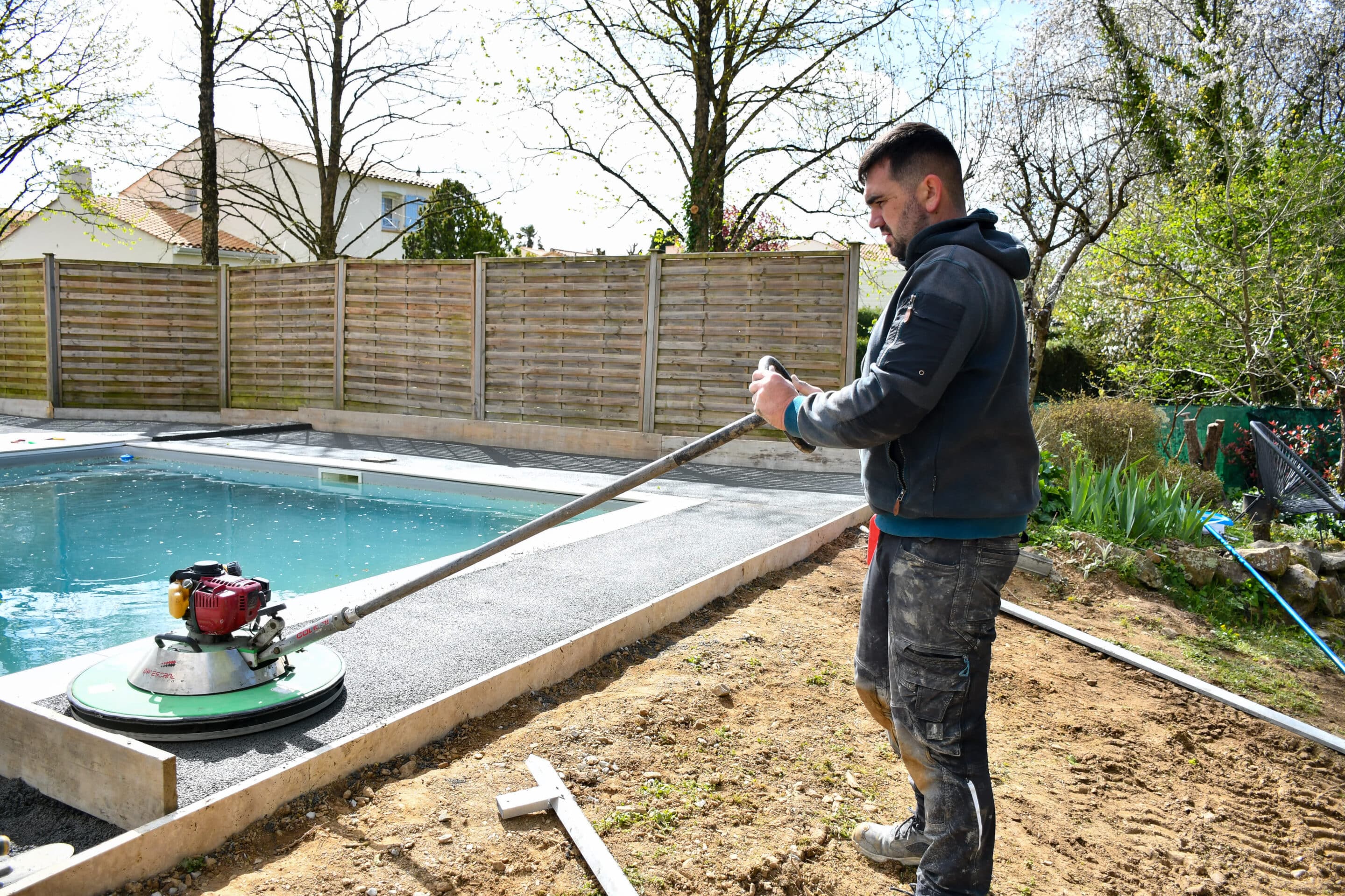 La pose du béton poreux a ensuite été réalisée avec méthode et attention. Nous avons coulé chaque portion, puis nivelé soigneusement le béton pour obtenir un rendu uniforme et fonctionnel. Par ailleurs, les zones autour de la piscine ont été traitées pour faciliter l’évacuation de l’eau, limitant ainsi les flaques et les risques de glissade.